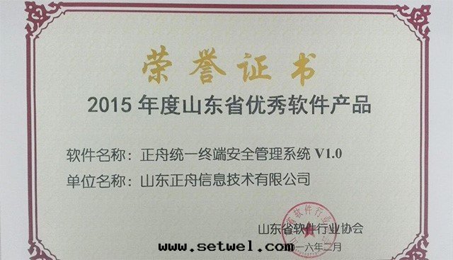 2016年(nián),山(shān)東(dōng)正(zhèng)舟信(xìn)息技術(shù)有限公(gōng)司喜報頻傳,2月(yuè)24日(rì)山(shān)東(dōng)省(shěng)软(ruǎn)件(jiàn)行業協会(huì)授予正(zhèng)舟信(xìn)息"2015年(nián)度(dù)山(shān)東(dōng)省(shěng)優秀软(ruǎn)件(jiàn)企業"称号(hào),"正(zhèng)舟統一(yī)終(zhōng)端安(ān)全(quán)管(guǎn)理(lǐ)系(xì)統V1.0"榮獲"2015年(nián)度(dù)山(shān)東(dōng)省(shěng)優秀软(ruǎn)件(jiàn)産品"。